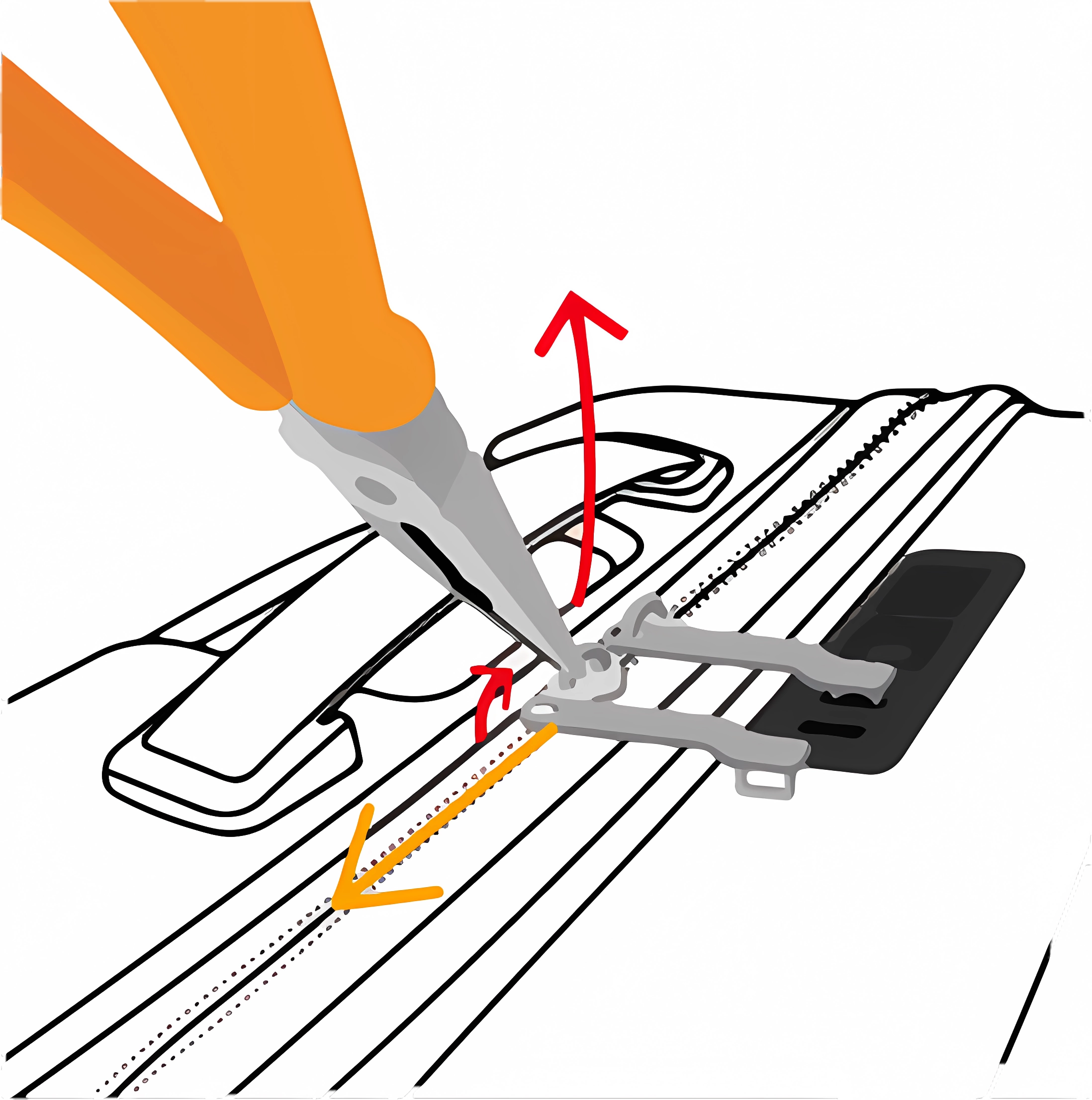 Der Reißverschlusskopf muss so weit geöffnet werden, dass der Reißverschluss-Zieher herausgezogen werden kann. Nachdem der beschädigte Reißverschluss-Zieher entfernt wurde, können Sie den Ersatz-Reißverschluss-Zieher einschieben.