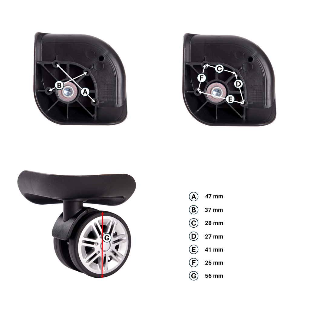 Um eine einheitliche Höhe zu erhalten und erhöhten Verschleiß zu vermeiden, wird empfohlen, alle Rollen des Koffers gleichzeitig zu ersetzen. Falls jedoch nur ein Rolle ersetzt werden muss, bieten wir separate Rollen mit zwei Ausrichtungen an, die perfekt auf das Gehäuse passen.