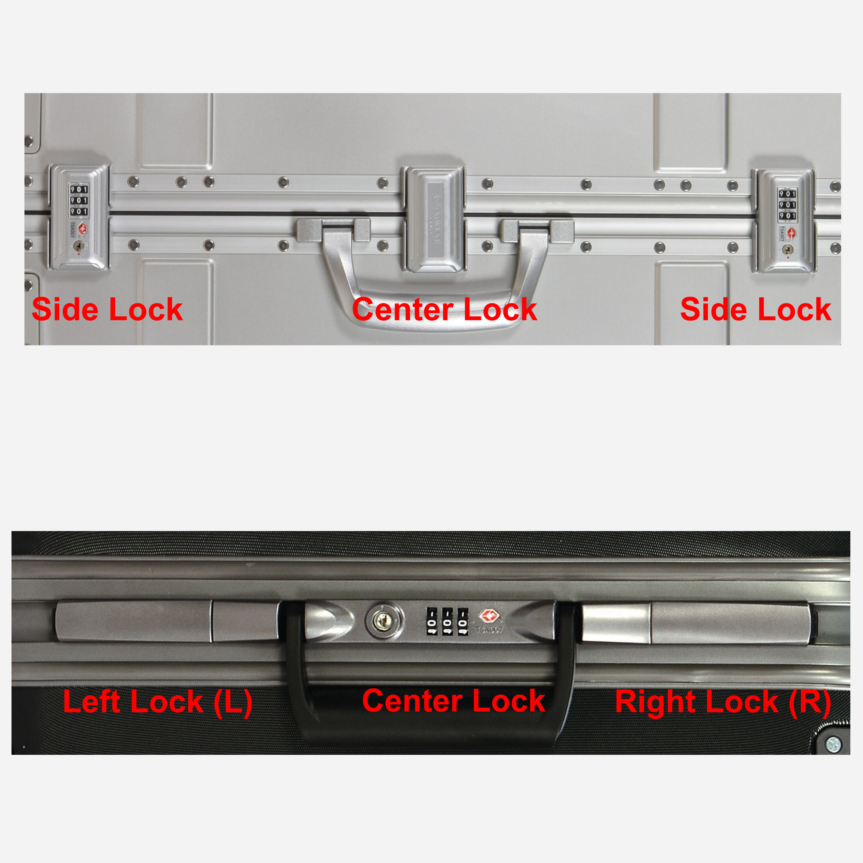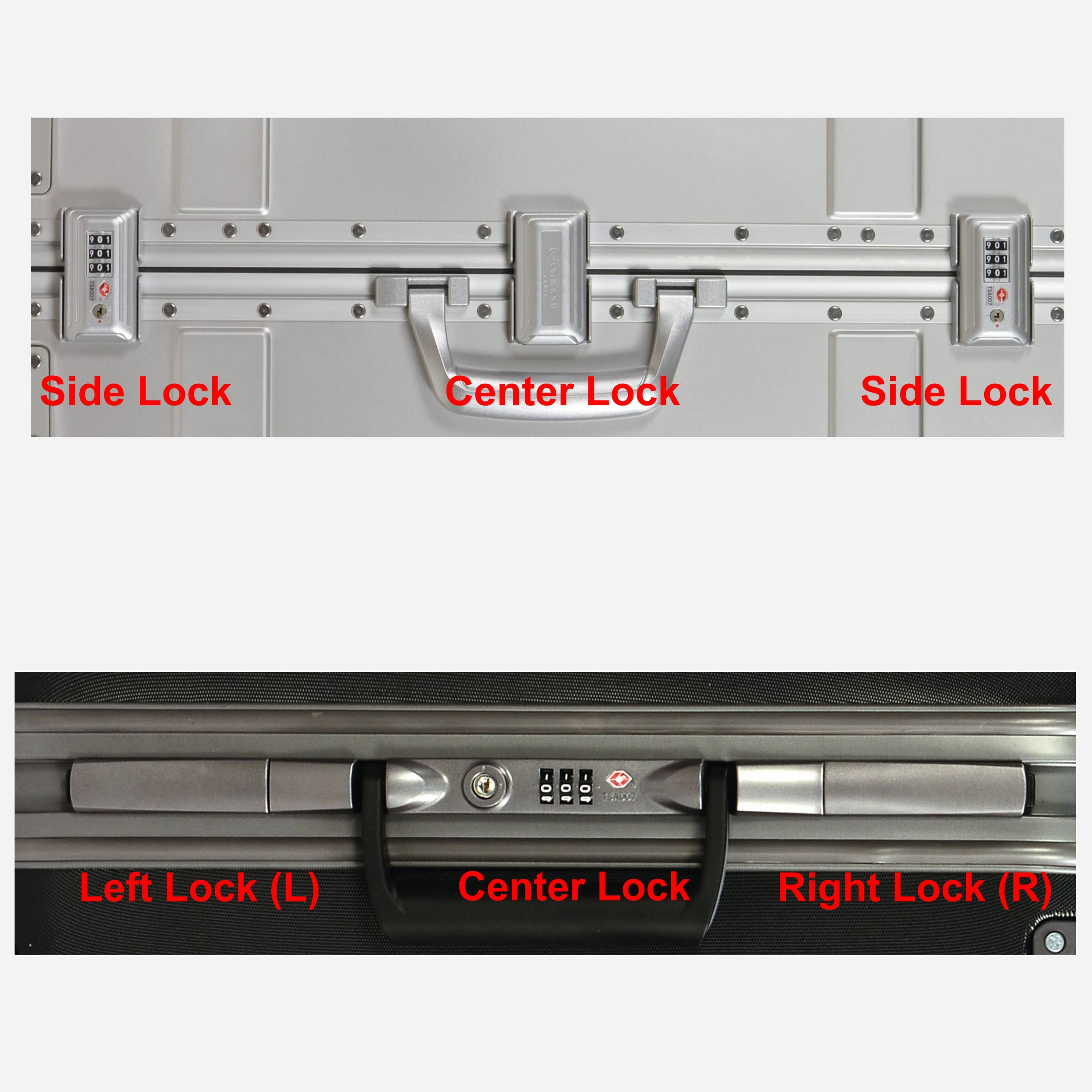 Come si può vedere dall'immagine, i lucchetti laterali possono essere identici o avere un'orientazione diversa a seconda del modello della valigia.